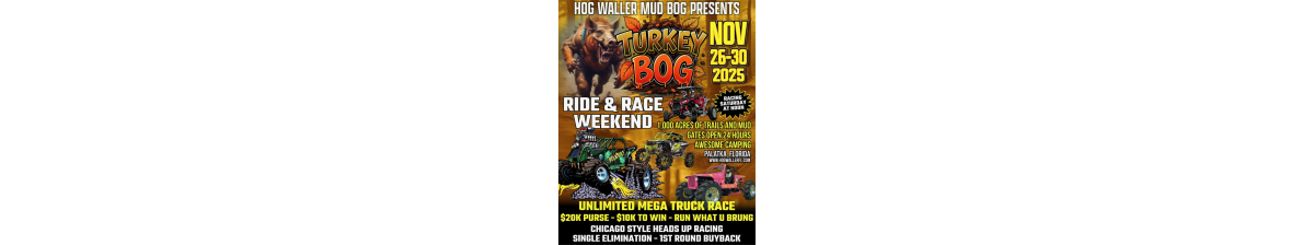 Racing begins Saturday at noon | 1,000 acres of trails and mud | Gates open 24 hours | Unlimited mega truck race and more!